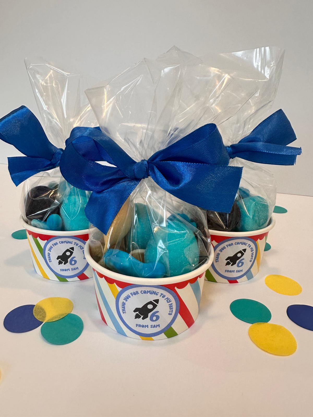 Fun sweety treaty gifts or favours for birthday parties, party bags or any celebration. Personalised to how you'd like them, simply choose your ribbon colour, theme and message and get them delivered to your door, easy peasy.