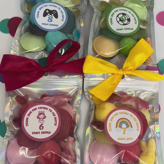 Fun sweety treaty gifts or favours for birthday parties, party bags or any celebration. Personalised to how you'd like them, simply choose your ribbon colour, theme and message and get them delivered to your door, easy peasy.